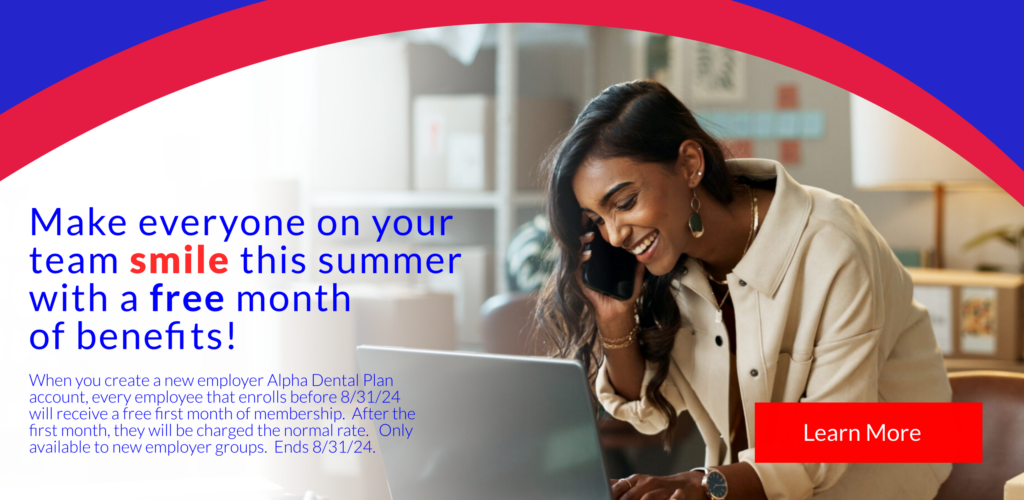 *Direct voluntary enrollment – With this solution, your employees can become a member of the Alpha Dental Plan through a custom webpage created just for you. They will pay out-of-pocket and can choose when to enroll and cancel. Best of all, they will receive all of the perks of being part of a group! All at no cost to the group.